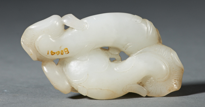序列号:203130101中文名:玉饰英文名:Jade Ornament保藏地点:历史文物馆尺寸:长7cm, 宽3.7cm材质:玉时代:清(1644 – 1911 CE)简述:清代圆雕玉器。玉质洁白润泽,玉工用简单的线条形象勾勒了两条小龙互相嬉戏的姿态,为典型的清代玉雕作品。收入出版物 《华东师范大学博物馆精品图集(一)》