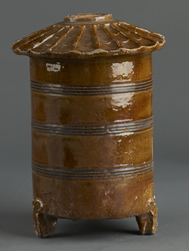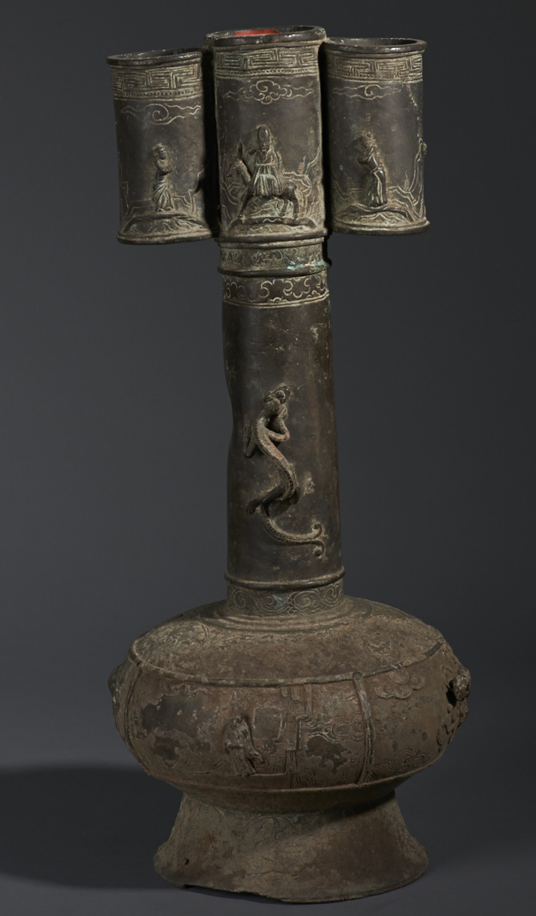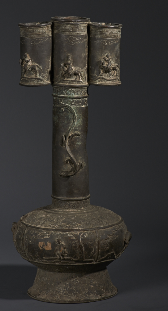 腹宽,颈长,口窄,脖外有两耳。此件投壶上密布纹饰。颈上部与两耳一面各浮雕有一骑行者,相对作揖,驰骋于山峦间,正各从一桥上过,上有云彩为背景;背面亦各浮雕一人,背景相似,中间者为一骑行官人,两边各立一人拱手向其作揖。口沿饰几何纹。颈部饰花朵纹饰,两面各浮雕一螭龙。腹部饰卷云纹、花草装饰,中有一官人坐于树下,被云雾环绕,如入仙境;背面为一官人迎风站立低头沉思;两侧各有一神兽,一立于高台,一腾云驾雾。整件器物装饰精致,刻画栩栩如生。